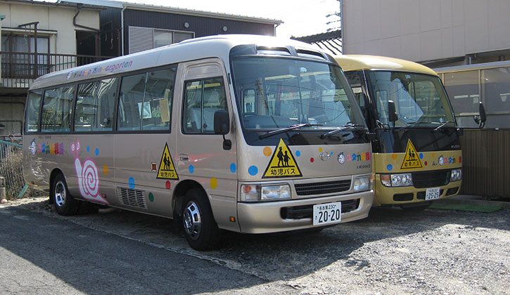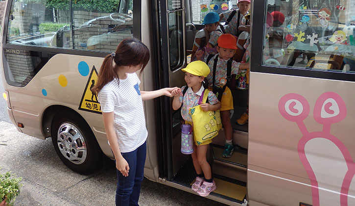 バス、送迎の子どもが登園します。