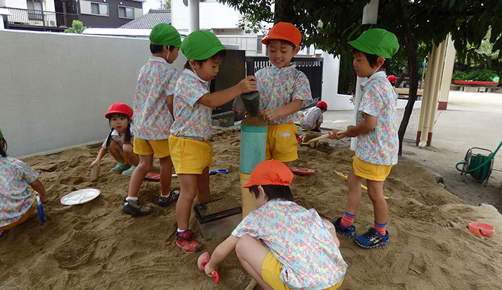 園庭の遊具で遊んだり、鬼ごっこや砂遊びなどをして遊んでいます。