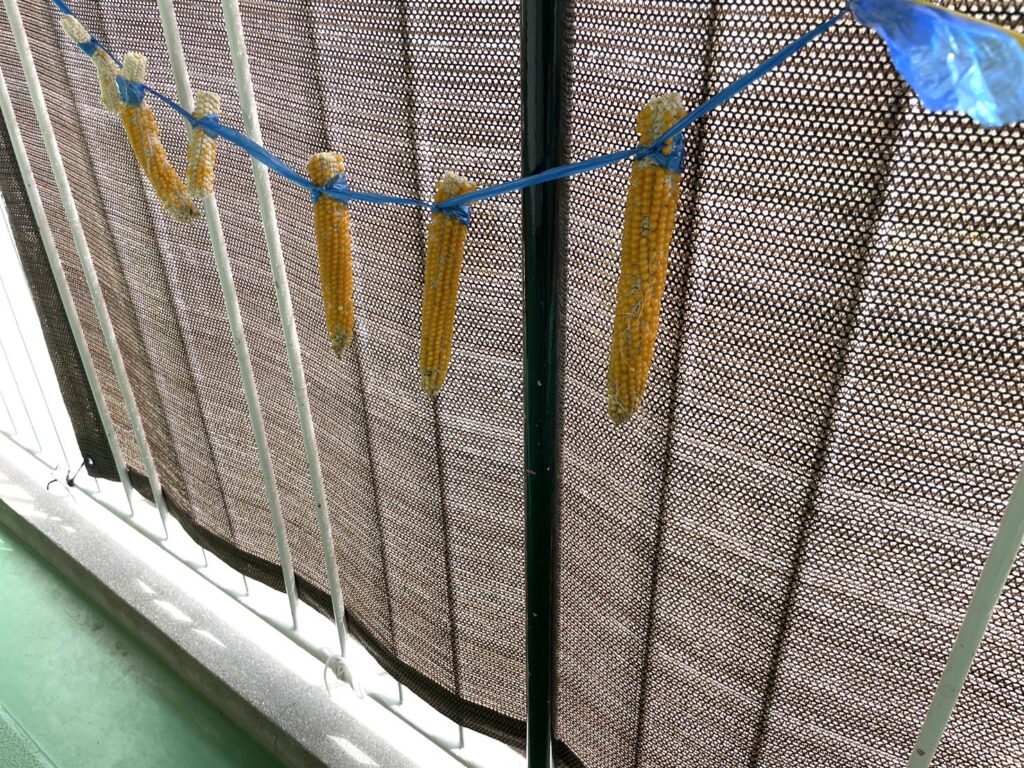 年長さんが育てたポップコーン(とうもろこし)を収穫して干してます。